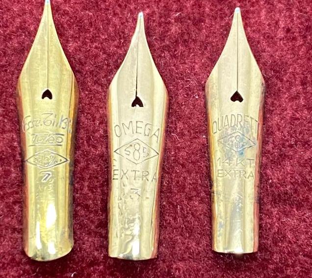 In the picture two nibs from Bologna: Esse.Ti.Bi (Tabo) and Quadretti (Colorado). I added the Omega nib (Omega AVM pens were manufactured by Columbus),because its geometry is very similar to the other two nibs.