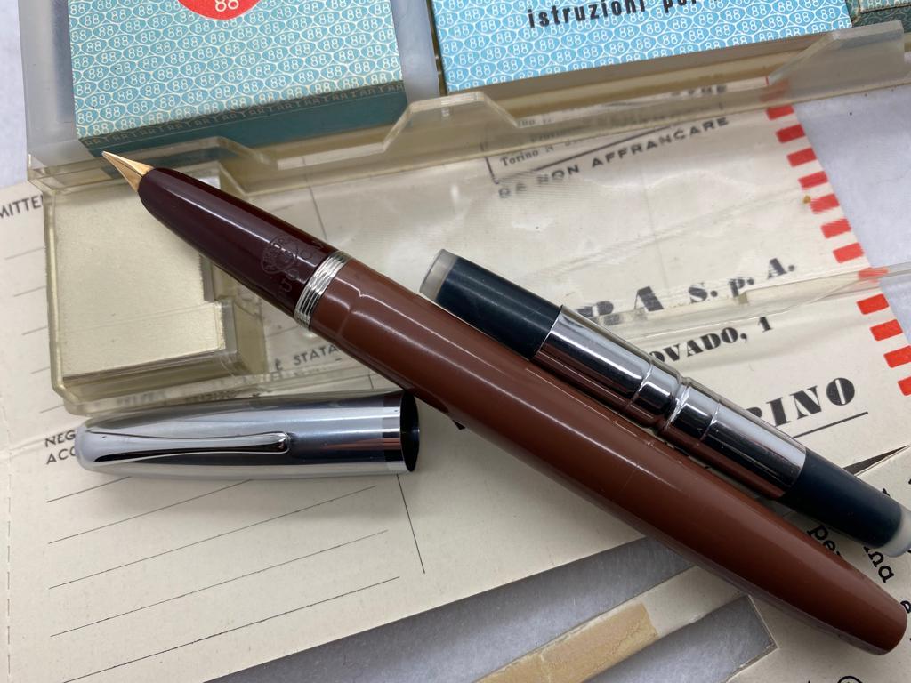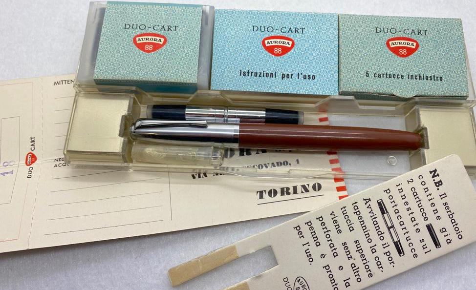 In 1954, Aurora introduced the Duocart, designed by Abe Steiner, which was provided with polythilene cartridges which could be housed in pairs inside the barrel of the pen.
