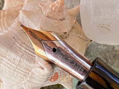 This Montblanc 142 in green striped celluloid is in excellent condition with only a minimal shade of amber on the barrel. It has a bumbed feeder and a very nice F nib.