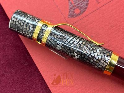 This unusual Ragtime model was part of a limited edition of 4 pieces called "The 4 Seasons (Le Stagioni) issued in 1993 in 300 pieces per color. Each season had a different color combination: Winter: gray and black, Summer: black and orange, Spring: blue and brown and Autumn: black and burgundy. Caps and blinds caps are in celluloid, while barrels are in acrylic. This Autumn Ragtime is fitted with a steel nib and is a converter/cartridge filler.