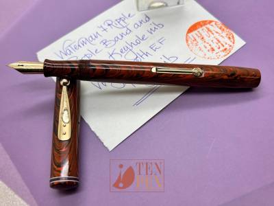 Waterman Ripple Nr 7 pens were introduced in 1927. The line comprised a number of pens with a colored cap band corresponding to a specific nib, identified by the same color of the band. The colors where red, purple, blue, black, yellow, green, gray and pink.