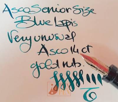 The nib is 14 ct gold marked Asco and has no vent hole.This feature is often found both on Asco nibs and Aurora nibs.