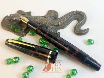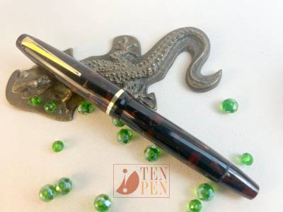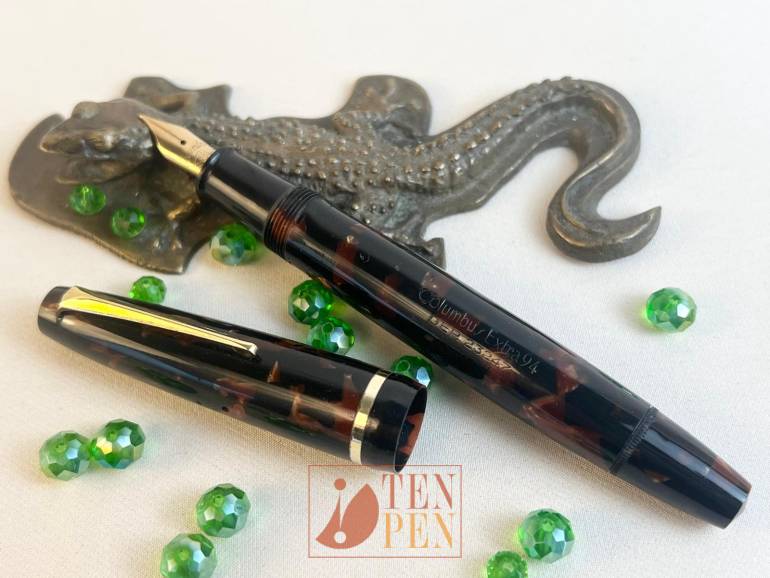 In the 1940s Columbus introduced a line of piston fillers in three sizes in a large array of colourful celluloids to try and get a foothold on the medium-priced share of the market. The 9x line was a solid and well build model with simple metal finish (a single cap band) whose strength was in the quality and liveliness of the colors. The model was manufactured in classical shades such as black, blue and brown tortoise but also in arco red and arco blue, flashy light green, light arco gray and lined black and pearl, among others.