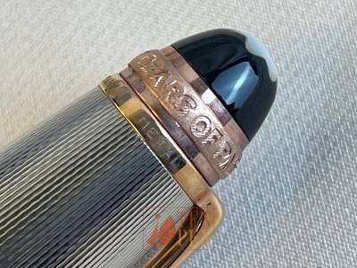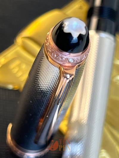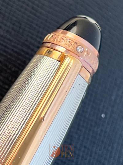 All the writing instruments are manufactured in silver with barley decoration  and have rose gold accents. The cap is decorated with. small diamond and the cap top sporta star in mother of pearl. Each pieces is individually numbered. The nib shows the 75th anniversary -75 years of Passion and Soul" logo.
