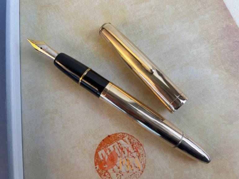 The 744 is the standard /gentleman size, while the 742 is the smaller/lady size. The model is slender and has a very aerodynamic look, perfectly in line with the fashion of the time and it is fitted with a telescopic piston.