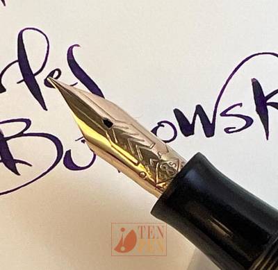 Two types of nibs were used on the new line of piston fillers: Extra nibs with the heart-shaped vent-hole on the ogival pens and Extra Lucens nibs for the facetted models.