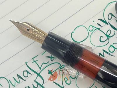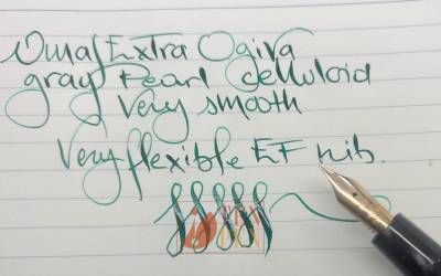 This Omas Extra Ogiva in gray pearl celluloid is a standard size and it is fitted with a very pleasant and flexible Omas Extra 14 ct nib. The nib is smooth and very flexible.