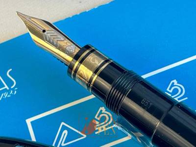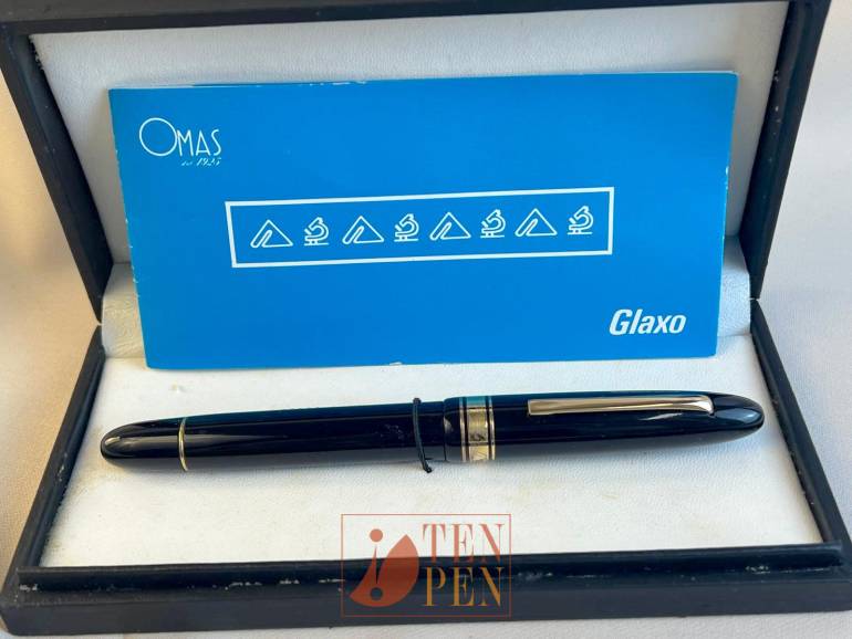 Confirming its tradition of collaboration with pharmaceutical companies, Omas manufactured this line of numbered Omas Extra oversize Ogivas with special metal trims on commission for Glaxo. The cap band and the section band show a few scientific instruments - namely an alembic and a microscope - which are presente in the booklet which accompanies the pen, too.