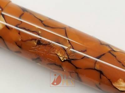This Stipula Etruria is a piston filler with solid silver cap band and clip. The color of this celluloid is called "orange marble"