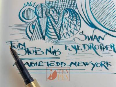 The pen is an eyedropper filler of the early 1900s and it is fitted with an old fashioned under-over feeder and a superb flexible nib with a stub tipping. The nib is of extremely high quality, responsive and springy, offering a very wide and generous line for upward and downward strokes and a thin, clean horizontal line. It's great to write and to draw.